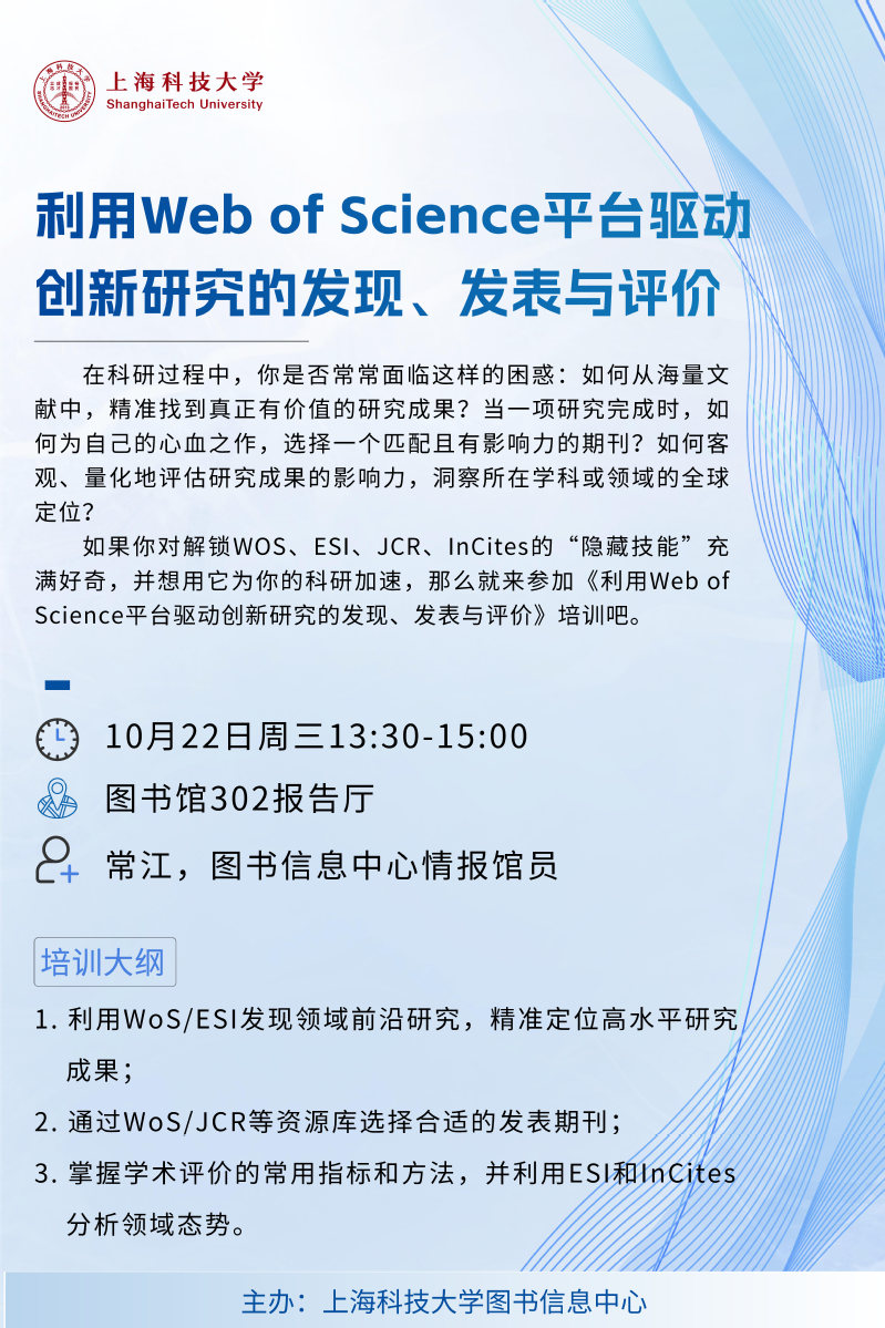 如果你对解锁WOS、ESI、JCR、InCites的“隐藏技能”充满好奇,并想用它为你的科研加速,那么就来参加《利用Web of Science平台驱动创新研究的发现、发表与评价》培训吧。