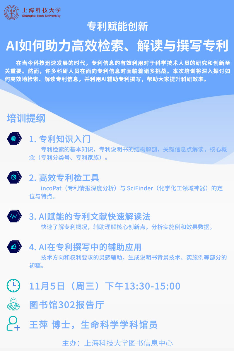 通过本次培训,您将获得实用的专利检索、解读和撰写技巧,掌握AI工具的应用,提升您的科研能力和创新思维。