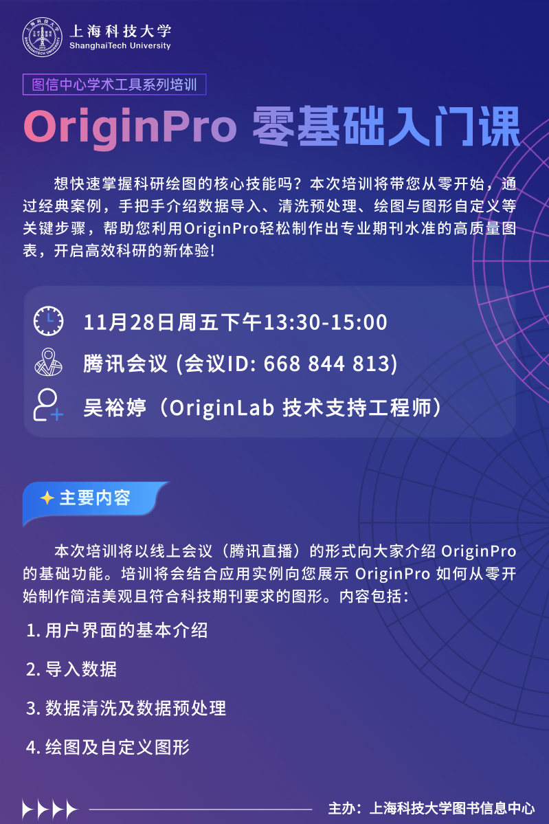 想快速掌握科研绘图的核心技能吗?本次培训将带您从零开始,通过经典案例,手把手介绍数据导入、清洗预处理、绘图与图形自定义等关键步骤,帮助您利用OriginPro轻松制作出专业期刊水准的高质量图表,开启高效科研的新体验!